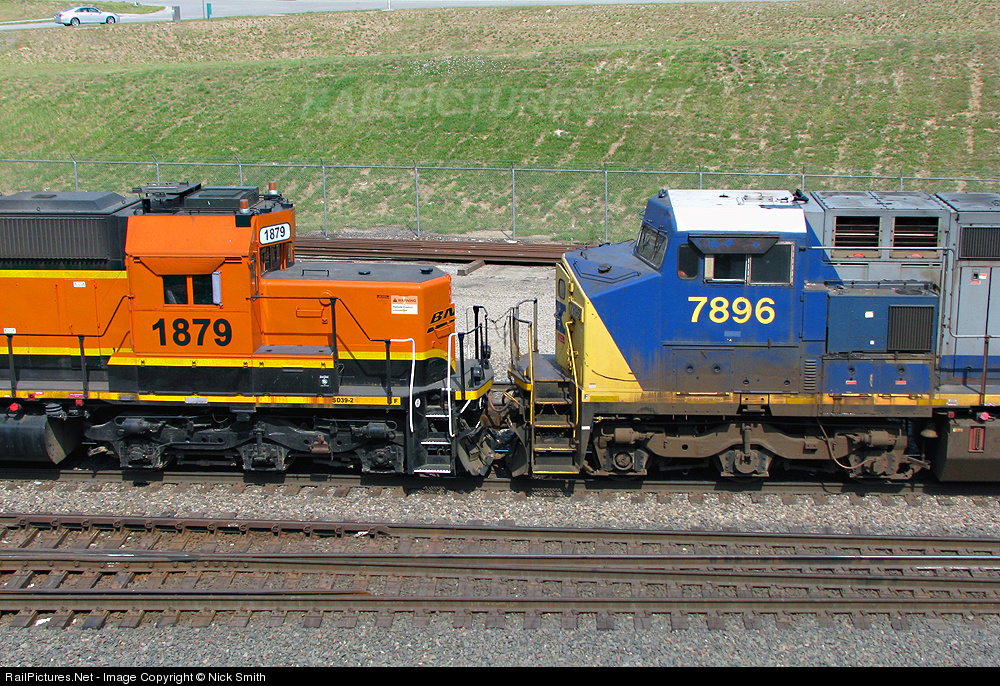 CSXT 7896 is the second motor running on borrowed time to the BNSF and snoot BNSF 1879 is in tow on a Washington-bound train tiptoeing through Kansas City's West Bottoms.