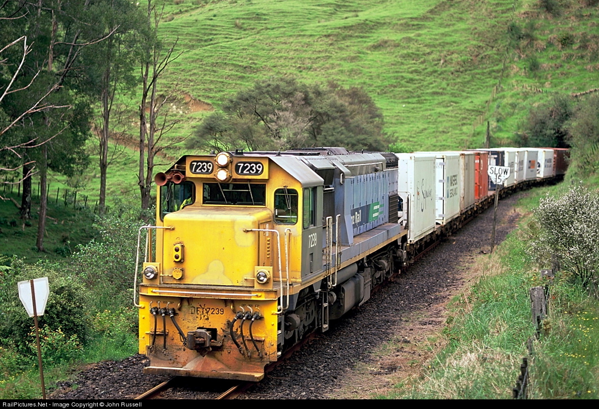 Trains on 3' 6" (1.067m) track from Whangarei to Bluff with virtually heritage rebuilt EMD and GE locomotives still the mainstay power. The network was privatized in 1990's and operated by Toll until 2008 when state owned KiwiRail was established.