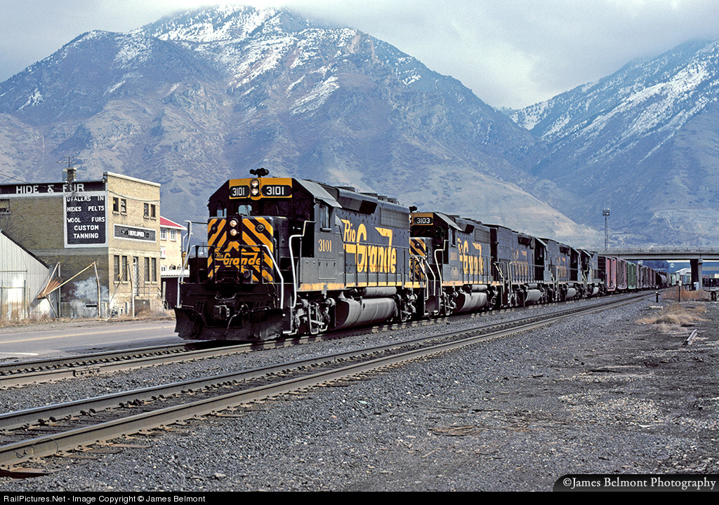 During a brief break in the clouds, the sun illuminates Rio Grande's 101 train blasting west through the first of four grade crossings in Provo City on March 8, 1987. Since commuter rail came to town in Dec, 2012, this area is a whistle-free 'quiet zone'.