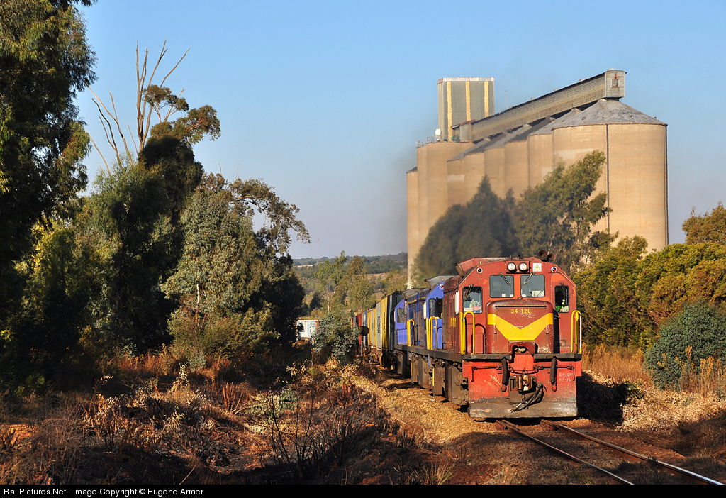Three class 34 GE U26C's, led by 34-120 in original SAR red livery, find a patch of sunlight between the surrounding foliage as they climb the grade out of Syferbult with their train of containers bound for Mafikeng. Photo taken during Tanago's 2013 South Africa tour.