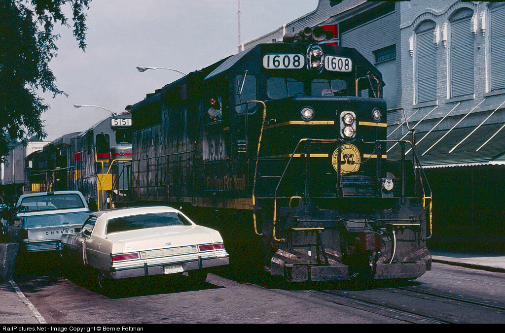 | Seaboard Coast Line GP40 #1608, leading B23-7 #5151 and U33B #1721, has one of the hottest trains on the railroad (piggyback train #320) down to walking speed as the engineer navigates street running. This problem was finally eliminated when a long-desired railroad bypass was constructed. #1608 was built May 1970 on order #7229 and later became Seaboard System/CSX #6762. Unit was chosen for CSX MofWay "Pumpkin Fleet" and re# CSX #9714 |
