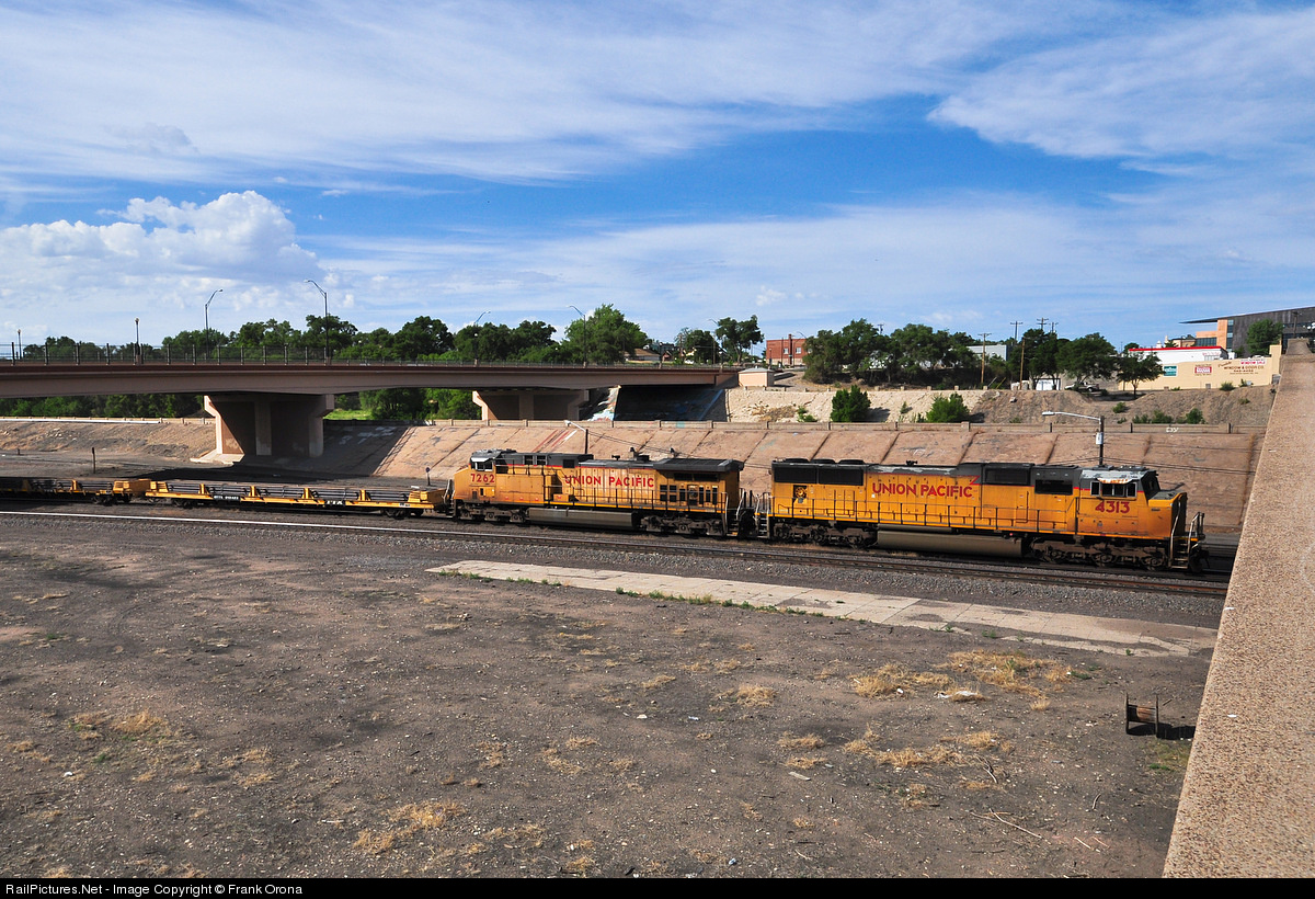 A unit rail train slowly makes its way toward the former Rio Grande yard with loads of 80 foot long rail bundled in packages of 5 rails wide and stacked 8 packages per car. This steel is 136 pound Nippon rail from the land of the rising sun and rolled in May of this year. In Pueblo it will be welded into strings of Continuous Welded Rail and sent somewhere along the massive UP system.