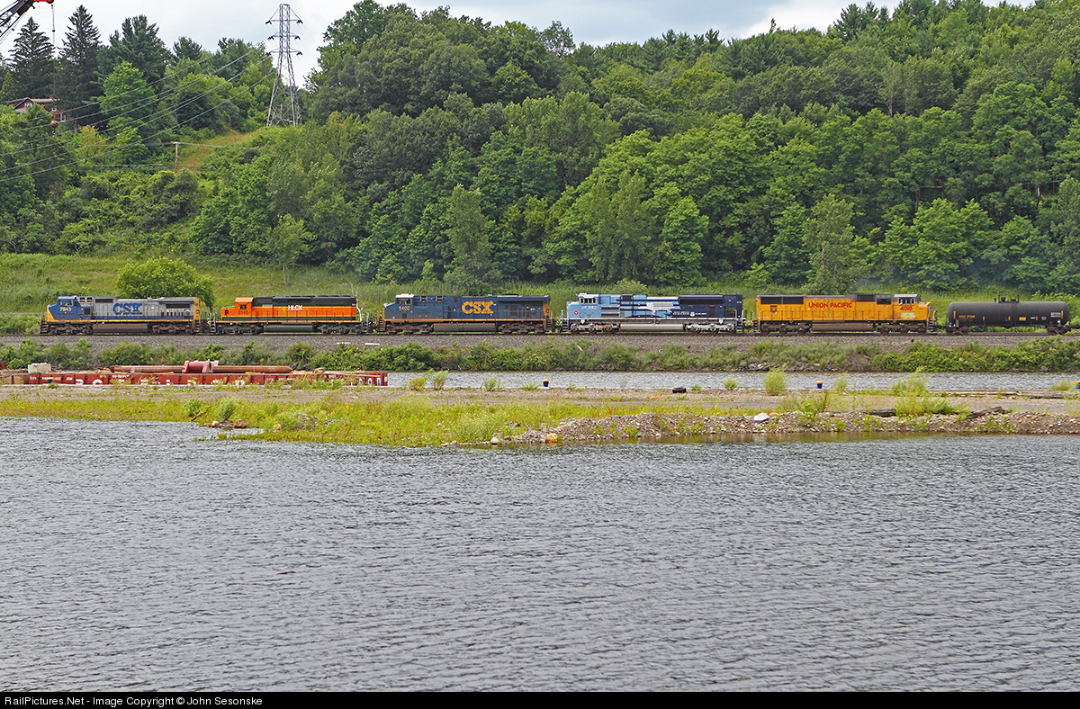 An Eagle rolls along the Mohawk as part of a 5 unit, 5 scheme consist. The Missouri Pacific heritage unit rolls along the Mohawk River by Lock 10 while making only its 2nd appearance on the CSX Selkirk Sub. Incredibly, its first appearance was almost to the day 3 years ago on July 22, 2010.