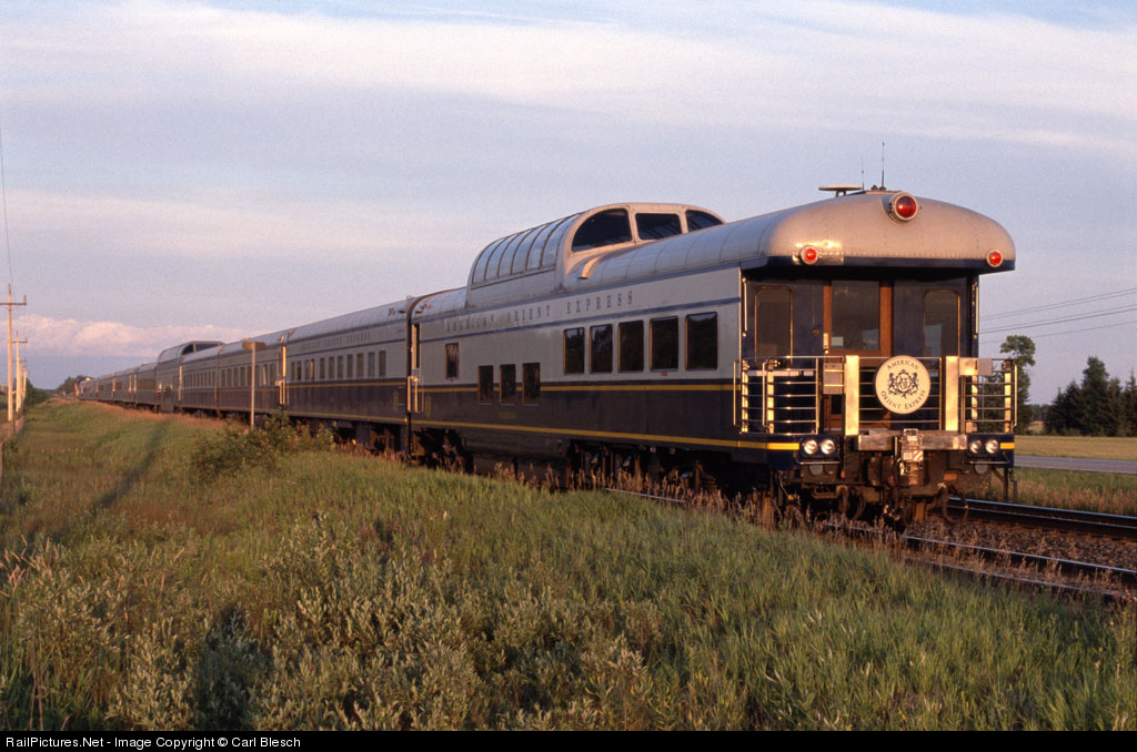 The American Orient Express heads east at sunset on a trans-Canada journey. Here it briefly dips into the United States to go around Lake of the Woods. This is on the Canadian National secondary main between Winnipeg, Manitoba and Thunder Bay, Ontario.