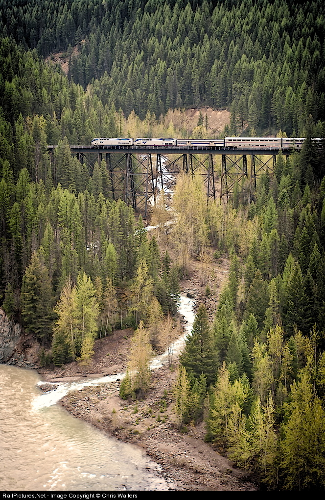 Amtrak's eastbound 'Empire Builder' crosses the former Great Northern trestle at Goatlick, between Essex and the top of Marias Pass, Montana.