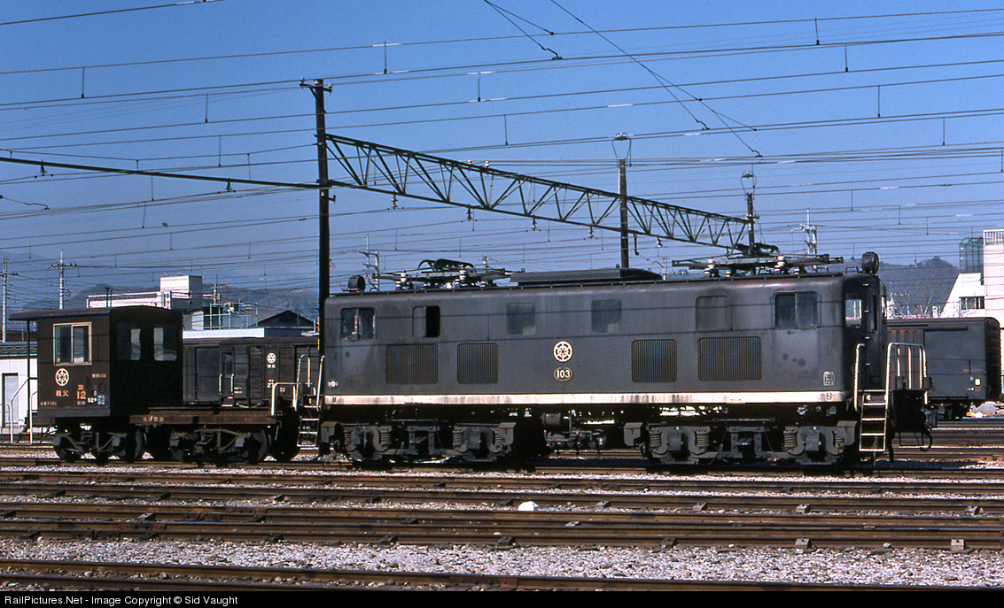 | Chichibu Railway is a private railway (shortline) owned by a cement company. Its units were totally unlike the electrics operated by the other railways in Saitama Province and its primary purpose was freight, unusual in Japan. They do have MU electric passenger trains. This unit and quaint caboose are idling. |