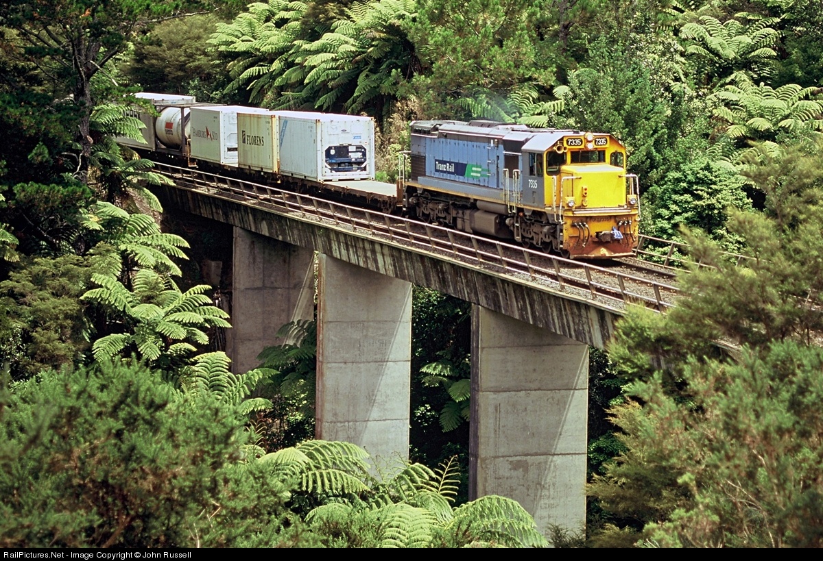Trains on 3' 6" (1.067m) track from Whangarei to Bluff with virtually heritage rebuilt EMD and GE locomotives still the mainstay power. The network was privatized in 1990's and operated by Toll until 2008 when state owned KiwiRail was established.