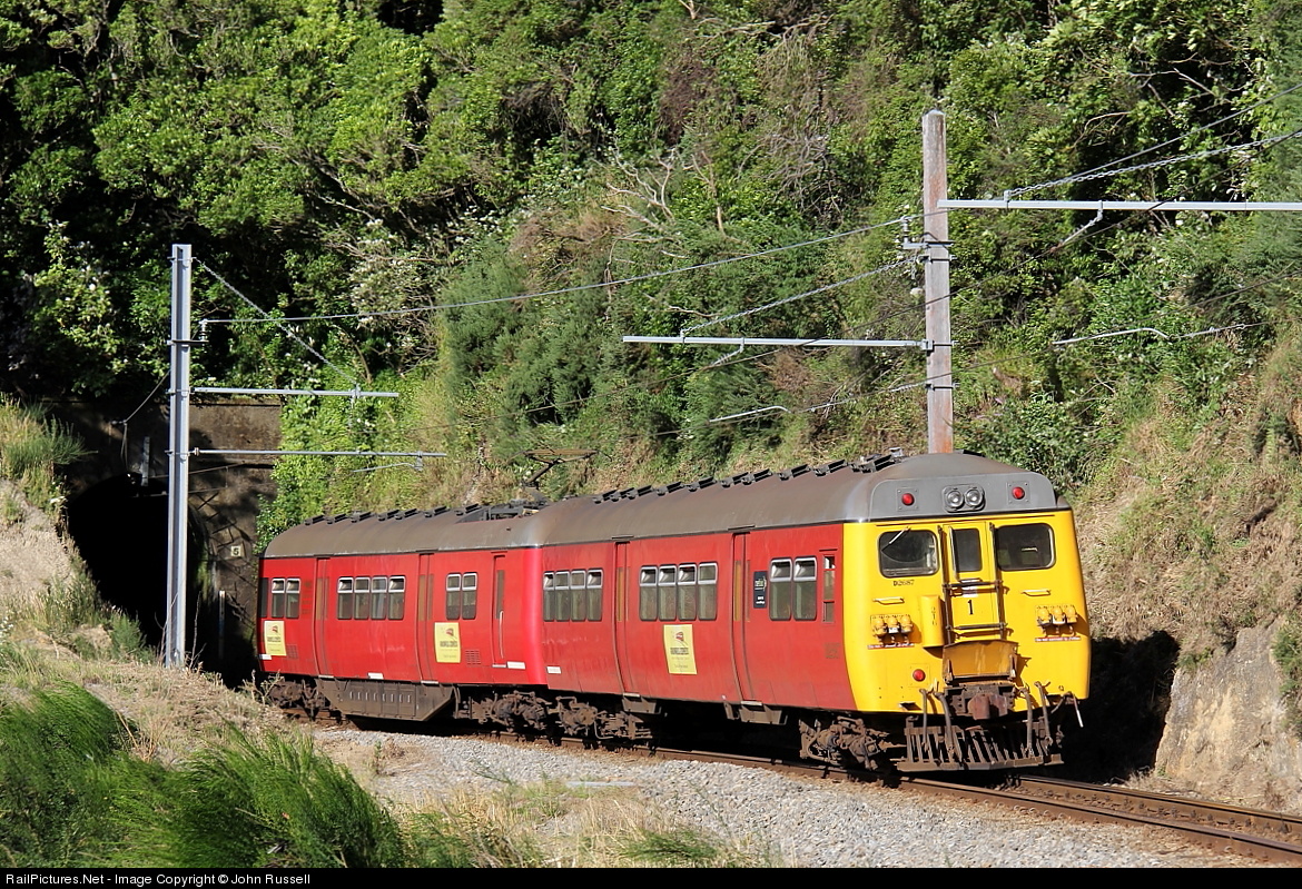 | A restored English Electric car set from early 1950's approaches Tunnel 5 on the Johnsonville Branch. This line has a 2.5% gradient and is part of the original route from Wellington to Auckland. When the Tawa Deviation opened in 1937, this line ended at Johnsonville and was electrified. |