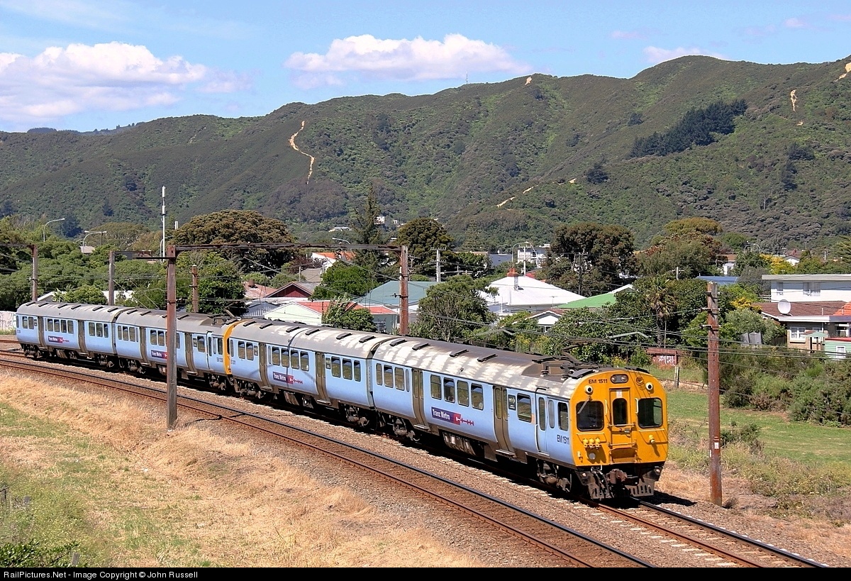 Tranz Metro Ganz Mavag units on Upper Hutt to Wellington service near Woburn. The system was electrified at 3000V DC from late 1940's. The distant Rimutaka Ranges were a formidable barrier for railways. A rare Fell center rail incline at 6.6% gradient (1 in 15) operated from 1878 until a 8.5Km long tunnel opened in 1955.