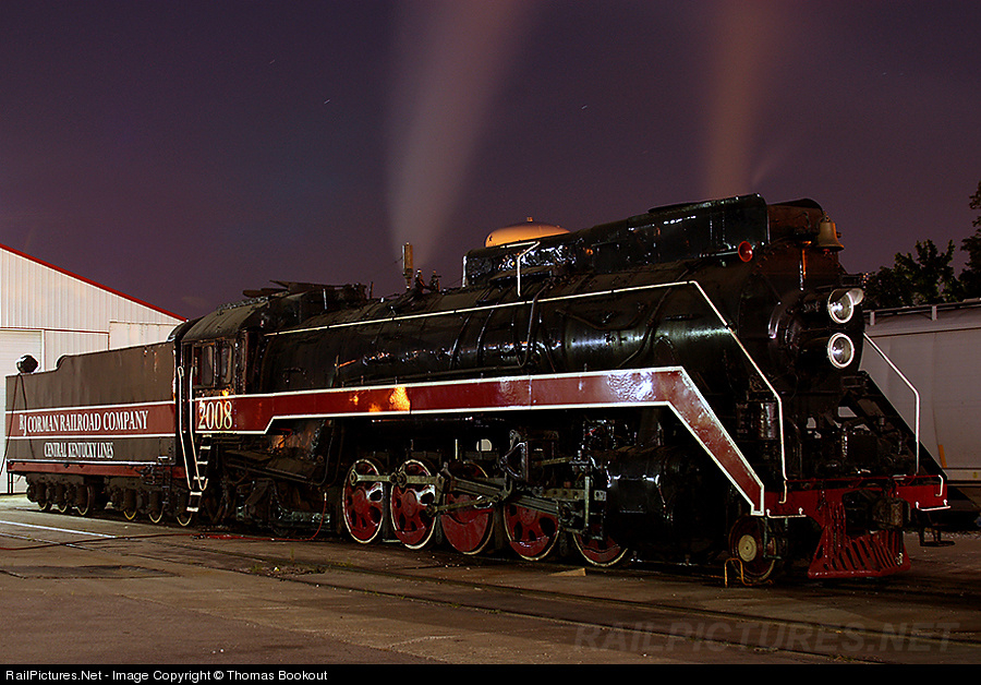 | RJ Corman Central Kentucky Lines' Chinese QJ Class 2-10-2 number 2008 simmers quietly on the ready track at Lexington's Rupp Yard. She awaits her call to duty under a clear sky and will be on the mainline with freight the next morning. |