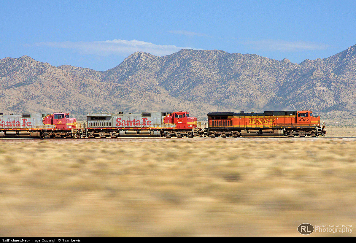 Pacing along Historic US RT 66, BNSF 4932 makes way Westbound with 2 original Santa Fe Dash 9's.