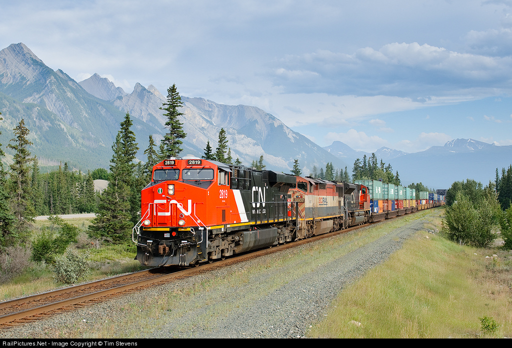 | Briefly escaping from coal service, CN ES44AC 2819 leads 12,000 feet of containers east. The unit was stolen from a coal set at Robert's Bank but would be taken off of train Q102 at Edmonton and sent back west. |
