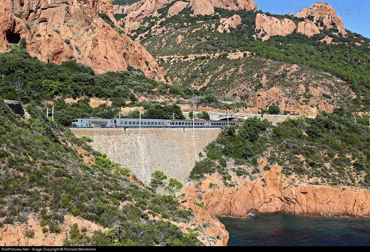 | Train Express Régional from Nice to Marseille along the Esterel Mountains. |