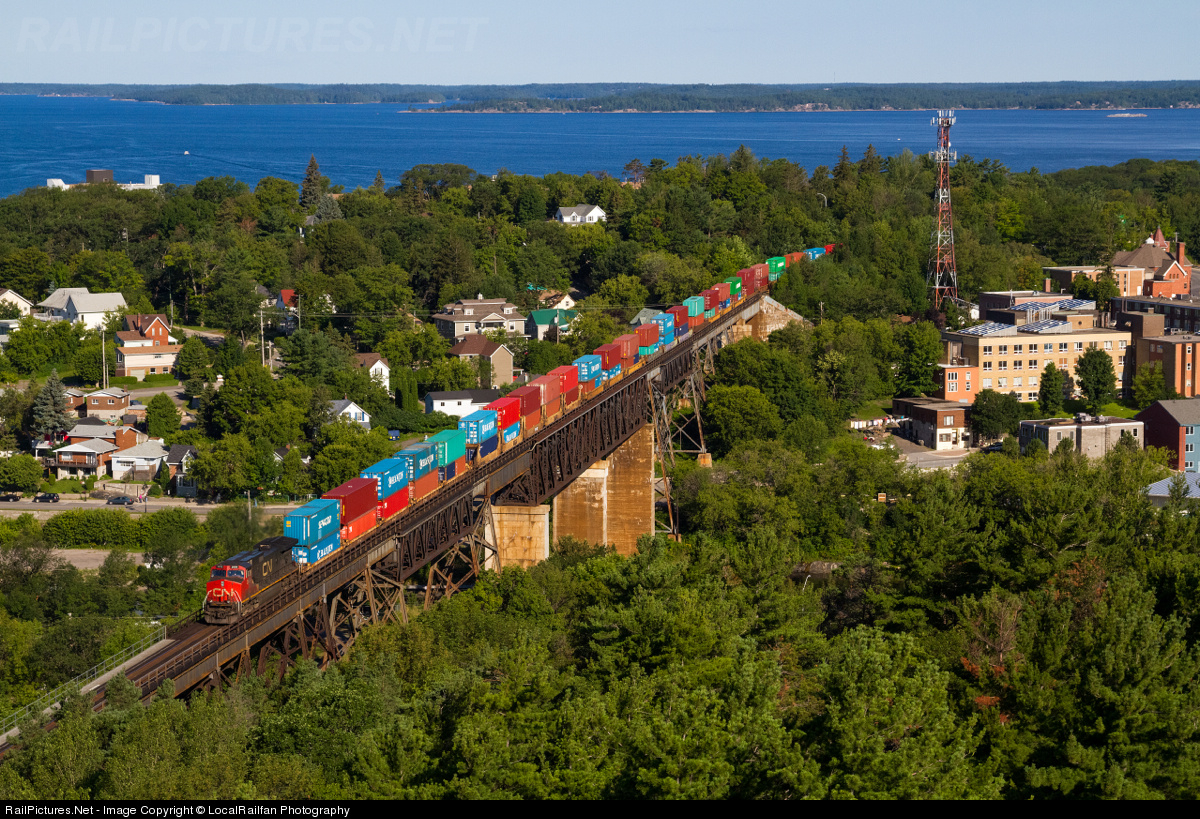 Arguably the best angle in all of Parry Sound, one can view the entire town and miles surrounding from atop the old fire tower, now observation tower. Growing up seeing photographs of Canadian Pacific passenger and freight trains crossing this magnificent bridge in various Canadian railroading books I have always wanted to capture a photo of my own from this location. Although Canadian Pacific no longer runs the trains similar to those captured in Greg McDonnell's book 'Stand Fast, Craigellachie!', for instance, and southbound trains no longer run over this bridge (because of a Directional Running agreement), one can still occasionally get lucky if either CN or CP runs a lengthy train requiring DPU assistance. This is exactly what occurred in this photo, on a crisp July morning, a huge difference compared to the hot and hazy weather days prior. CN Q103 is seen soaring high above town with a hotshot stack train for the west coast, leading the train nearly a mile away is CN 8896, in the middle 2114 was shoving hard and doing the honours on the rear was IC 2698.