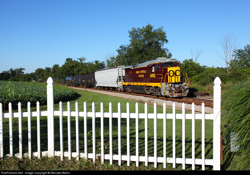| The former B&O main from Columbus to Pittsburgh still gets traffic from Zanesville to Cambridge in the form of this short local lead by one of two Ohio Central painted Super-7's. |