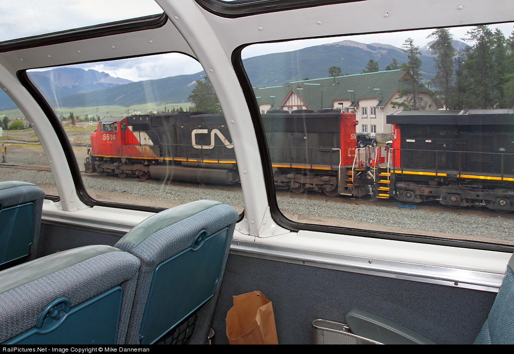 As seen from the dome of Banff Park on the rear of VIA’s train No. 2, the Canadian, an eastbound Canadian National freight arrives for a crew change at Jasper, Alberta, during the train’s station stop at this town located inside beautiful Jasper National Park