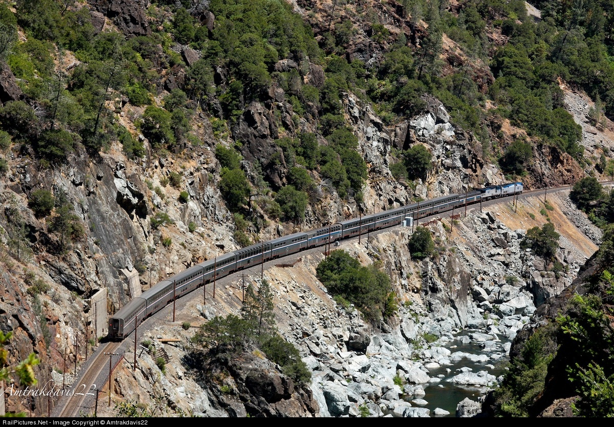 | Amtrak's detoured Coast Starlight continues its journey along the Feather River Route as it rolls through Pulga, California. Soon the train will be out of the mountains and into the scorching hot Sacramento Valley running about 10 hours late. |