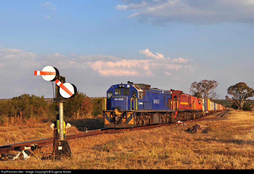 A westbound container train runs through the loop at Mazista siding near Swartruggens, while the Drivers Assistant of the opposing train looks on. The disc signal is connected to the point lever to indicate which way the points are set. This was once a manned station with semaphore signals.