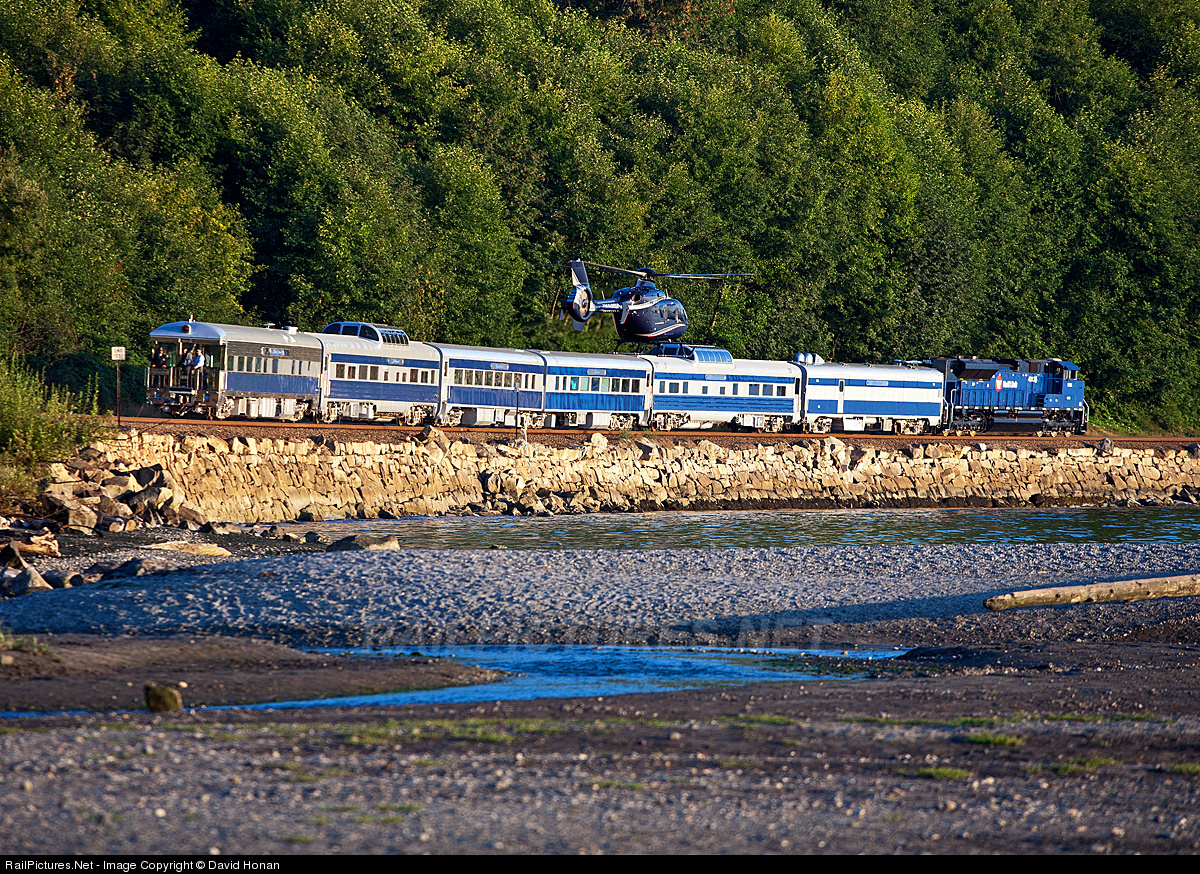 Stalked by a black helicopter: MRL's OCS was preceded along its run from New Westminster by a black helicopter, presumably providing security oversight ahead of the train -- and perhaps providing a unique perch for MRL's own photographer as it was decorated with a Washington Company logo on its underside. In this view the chopper follows the train along the shore of Puget Sound, passing the sandbar where Pipers Creek empties into the large saltwater body; three passengers and a well-dressed crew member ride the rear platform of observation car Silver Cloud.