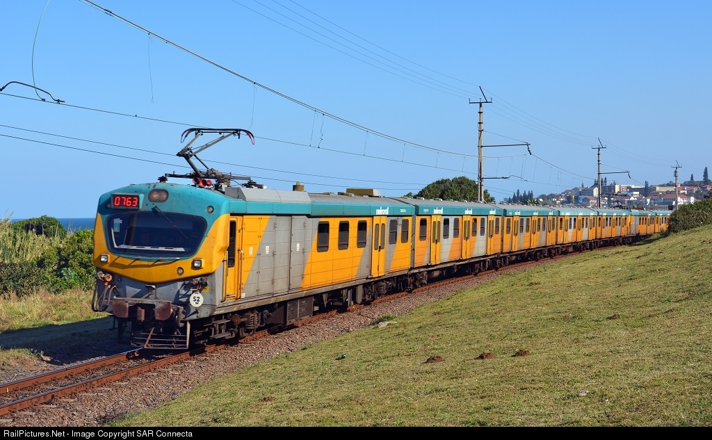 | A 10M5 Metrorail set, Train No. 0763, en-route to Durban from Kelso, is about to make a stop at Ilfracombe Station on the KwaZulu Natal South Coast. |