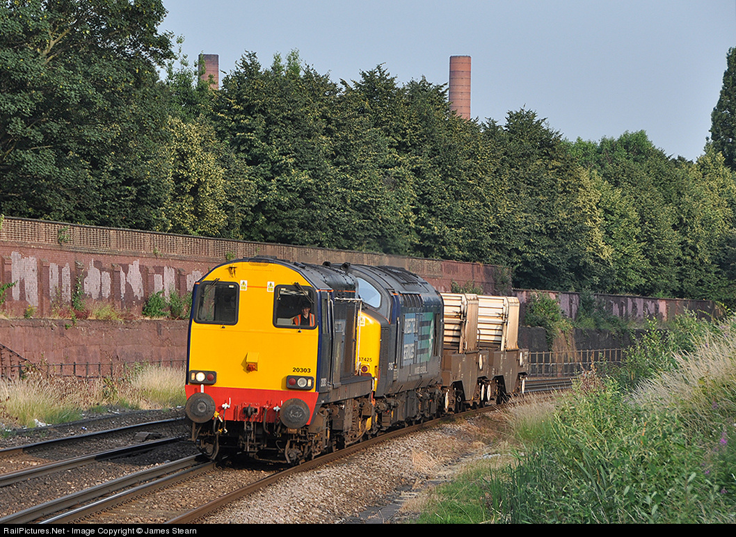 | 20303 and 37425 are in charge of the Dungeness - Willesden nuclear flask train. The train which runs approximately weekly, but can only be photographed in London during summer is seen passing through West Brompton. The chimneys in the background are part of the former Lots Road Power Station which generated electricity for the London Underground untill its closer in 2002. |