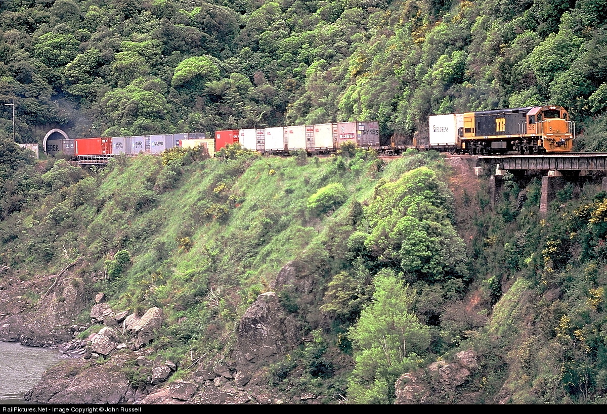 | Mixed manifest train from Palmerston North to Napier emerges from Tunnel 2 in the Manawatu Gorge. The line was built with mainly hand tools in the 1880's. Photo taken from along highway supported on bridge sections along the other side of the gorge. |