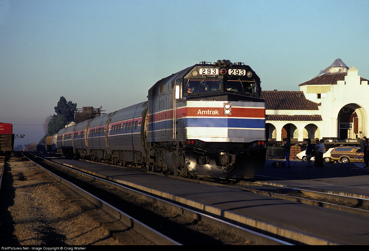 On the first day of 1981, Amtrak San Diegan #572 rolls into the station at Fullerton, California. The San Diego-bound train, comprised of F40PHR 293 and five Amfleet cars, is passing by the former Union Pacific station, which had just recently been moved to the Amtrak (ex-Santa Fe) station's parking lot. Note that the UP structure, which was formerly on the other side of the tracks and the other side of Harbor Boulevard, has not yet been set down and is still raised on cribbing while the foundation is created. The UP depot will become an Old Spaghetti Factory restaurant, and this entire area will later become a transportation hub, serving Amtrak, Metrolink and transit buses. Big changes were in store for this area!