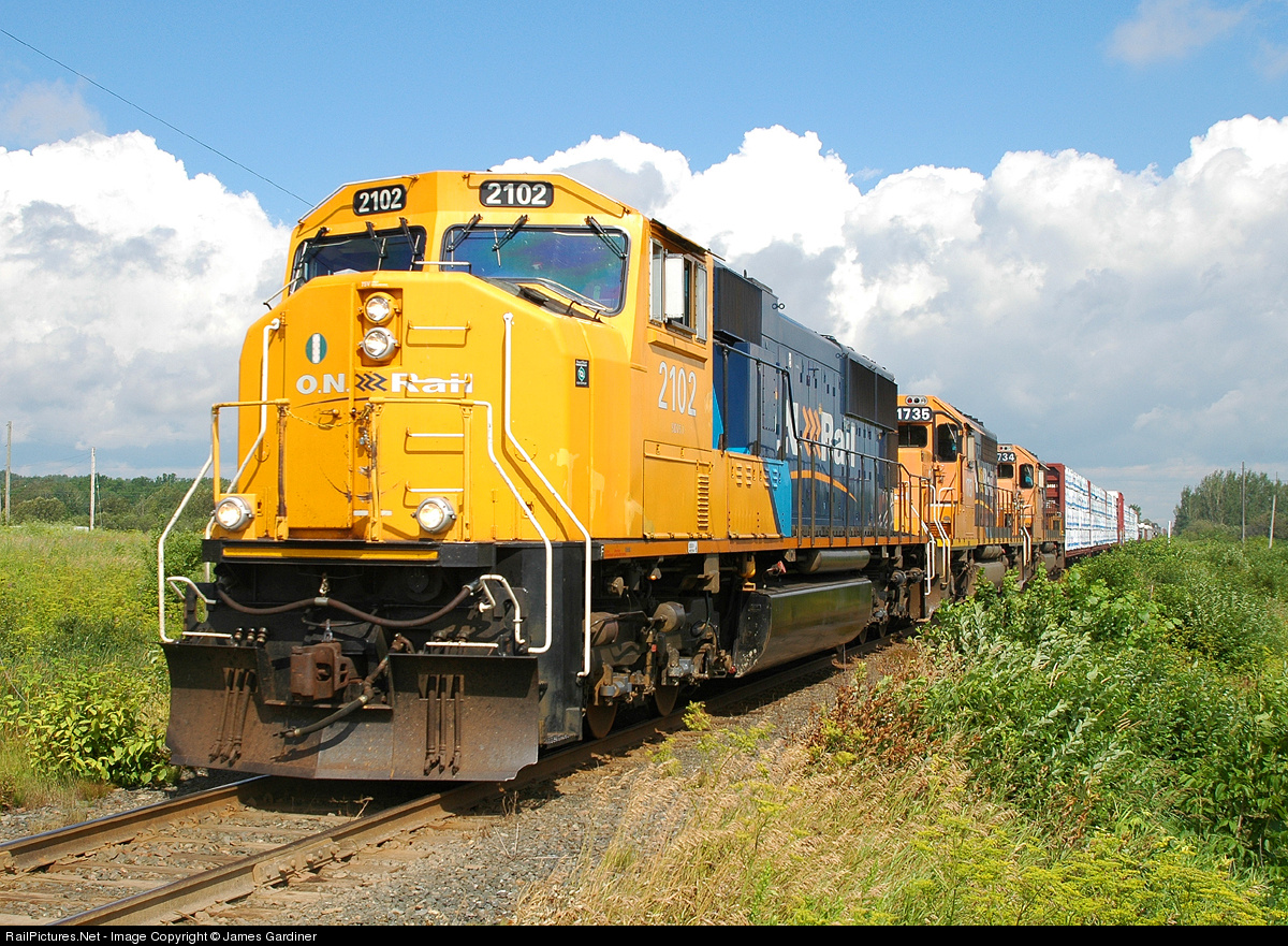 ON 214 passing through New Liskeard on it's way to North Bay, with ONR 2102 - ONR 1735 - ONR 1734