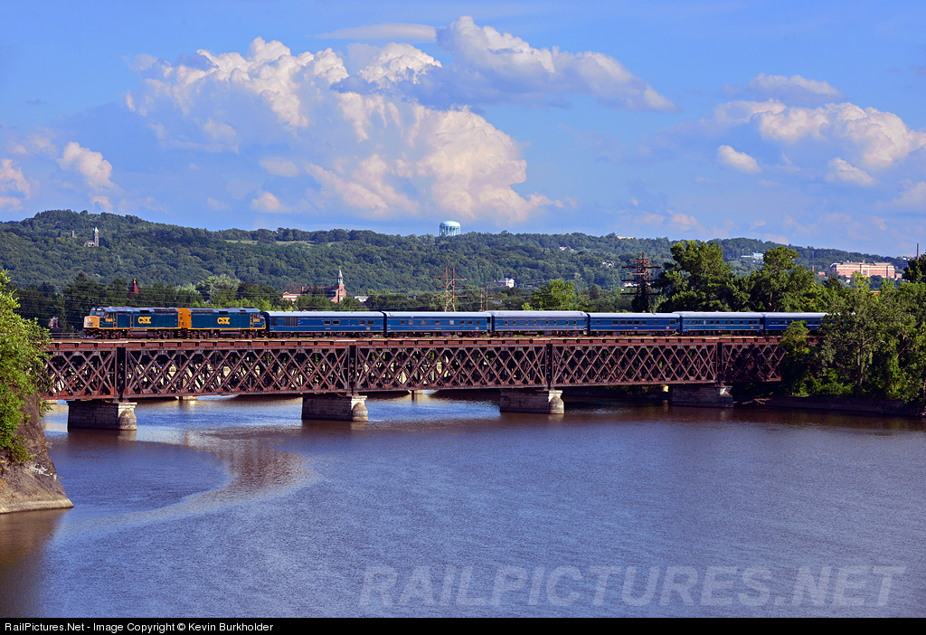 A CSXT Customer Special from North Bergen, New Jersey to Saratoga Springs, New York is seen crossing the Mohawk River on Canadian Pacific Railway's Colonie Main at Cohoes, New York. The train, led by CSXT F40PHs 9998 and 9993, carried ten office cars for customers and executives to attend the 150th Anniversary of the Saratoga Racetrack and to attend other functions at Saratoga Springs.