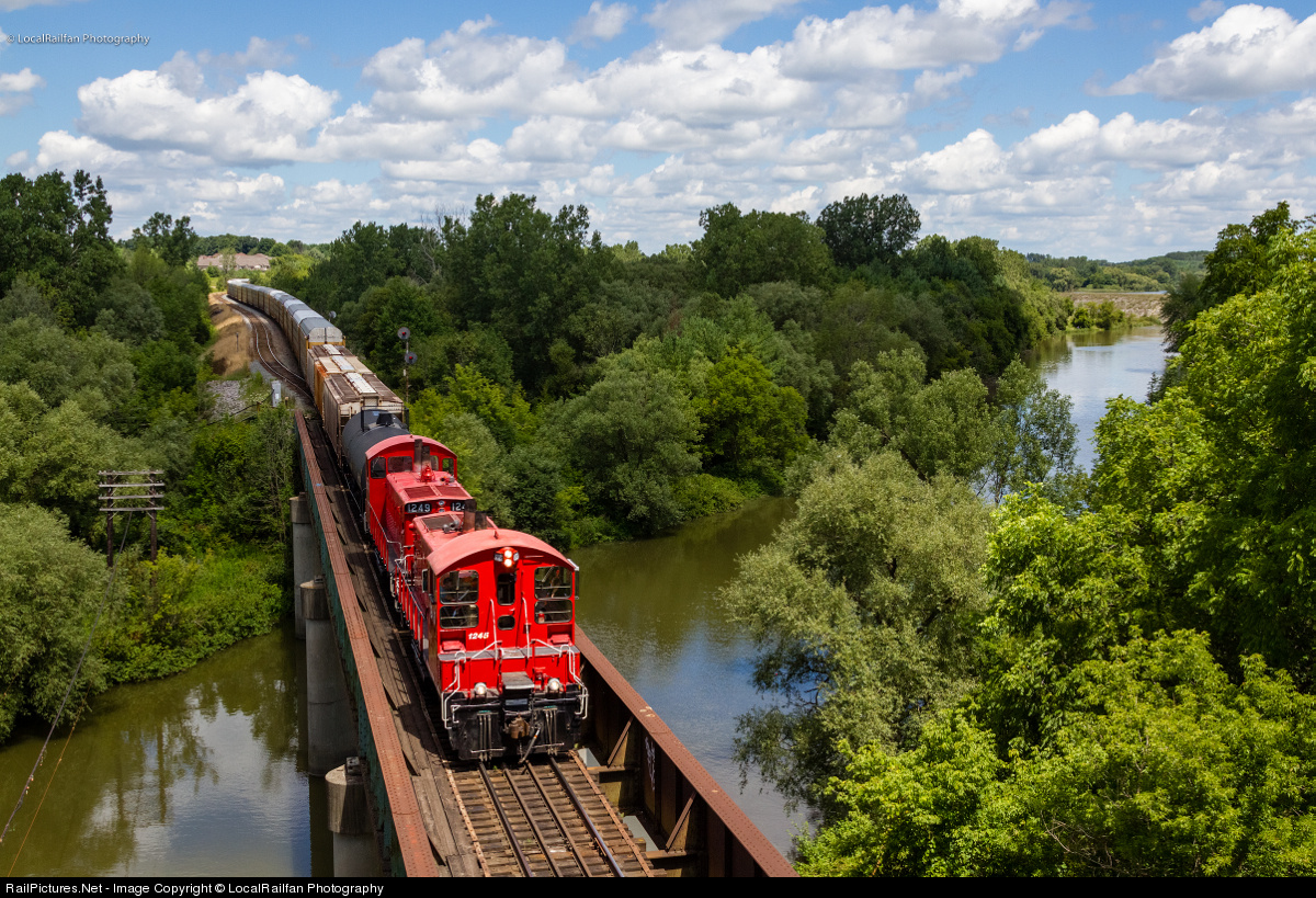 | Ontario Southland's daily CAMI job has completed its work at West Coakley, and with a pair of venerable ex-CP SW1200s for power, chugs over the Thames River with empties on the return to CAMI. |