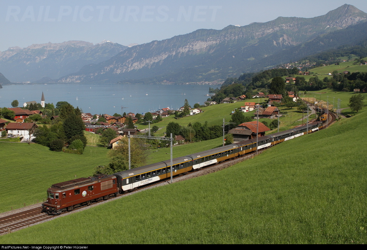 | During the summer it's quite rare to see the alps without any clouds on a sunny eveneing. Often some harmless cumulonimbus are wafting over the mountains. Not on that day so I've had the chance to get a decent shot of the Re 4/4 163 pulling the GoldenPass RegioExpress train towards Spiez. |
