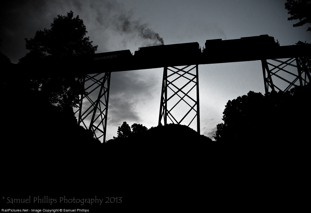 At dusk, a heavy southbound loaded coal train weighing 13,000 tons, crawls across massive Trace Fork Viaduct in Amonate, Va., with locomotives in notch-8 permeating the late afternoon air, while assaulting 1.8-percent Bandy Hill operating as train No. 80A. This is NS's highly intriguing and scenic Dry Fork Branch that spans 42-miles between Iaeger, W.Va., and Cedar Bluff, Va., at a connection with the Clinch Valley mainline.