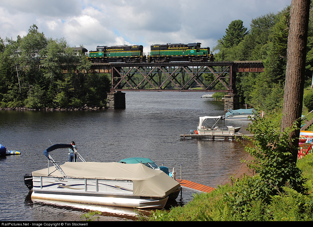Pontoons, pine trees, and pristine lake waters: It's a classic Adirondack scene as Saturday's railfan weekend special from Utica to Big Moose crosses Kayuta Lake in Forestport, NY. Leading the train are the Adirondack Scenic's two freshly-painted, former Canadian Pacific Alco RS-18s.