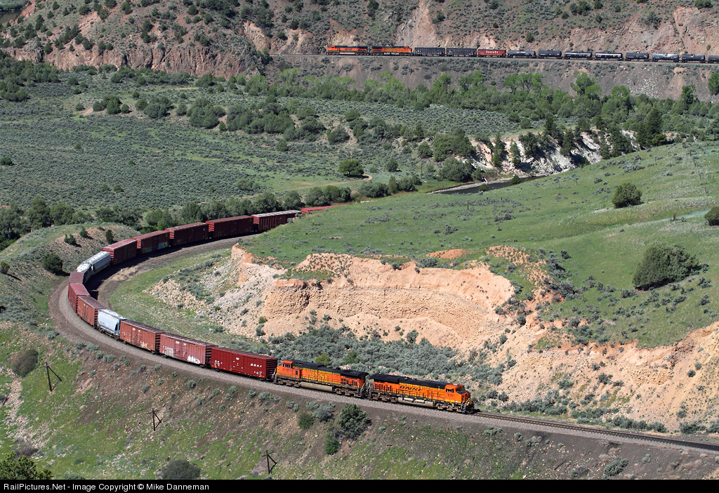 Traveling Union Pacific’s Moffat Tunnel Subdivision, an eastbound BNSF freight snakes along the Colorado River east of Radium, Colorado, on the morning of June 6, 2013. The front of the train is entering Little Gore Canyon, while the rear of the train with two Dash 9s acting as DPUs has just exited 463-foot Tunnel 42 in the background.