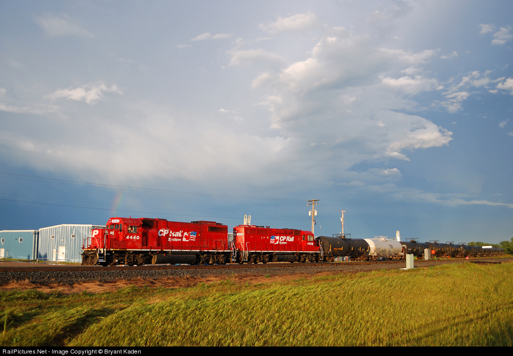 | Strong summer thunderstorms have given way to brilliant sunlight and a faint rainbow as the CP switch job out of Glenwood picks up some empty fertilizer tank cars from West Central Industries in Brooten. The tank cars are on the last remaining segment of the former Soo Line branch to Superior known as the Brooten Line. |