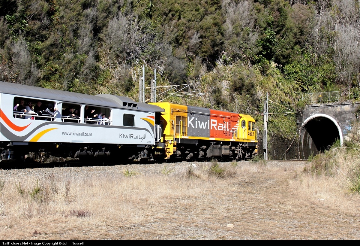 Trains on 3' 6" (1.067m) track from Whangarei to Bluff with virtually heritage rebuilt EMD and GE locomotives still the mainstay power. The network was privatized in 1990's and operated by Toll until 2008 when state owned KiwiRail was established.