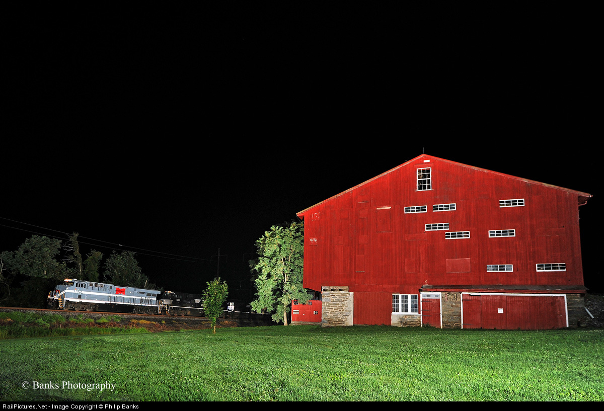 On a double Heritage Unit night, the NS 8025 on 64R and the NS 8101 on the 23W were traveling the Port Road on the same night it opposite directions. Here NS 8025 (Monongehela Heritage) is passing one of the barns of Lancaster County in Columbia, Pa.