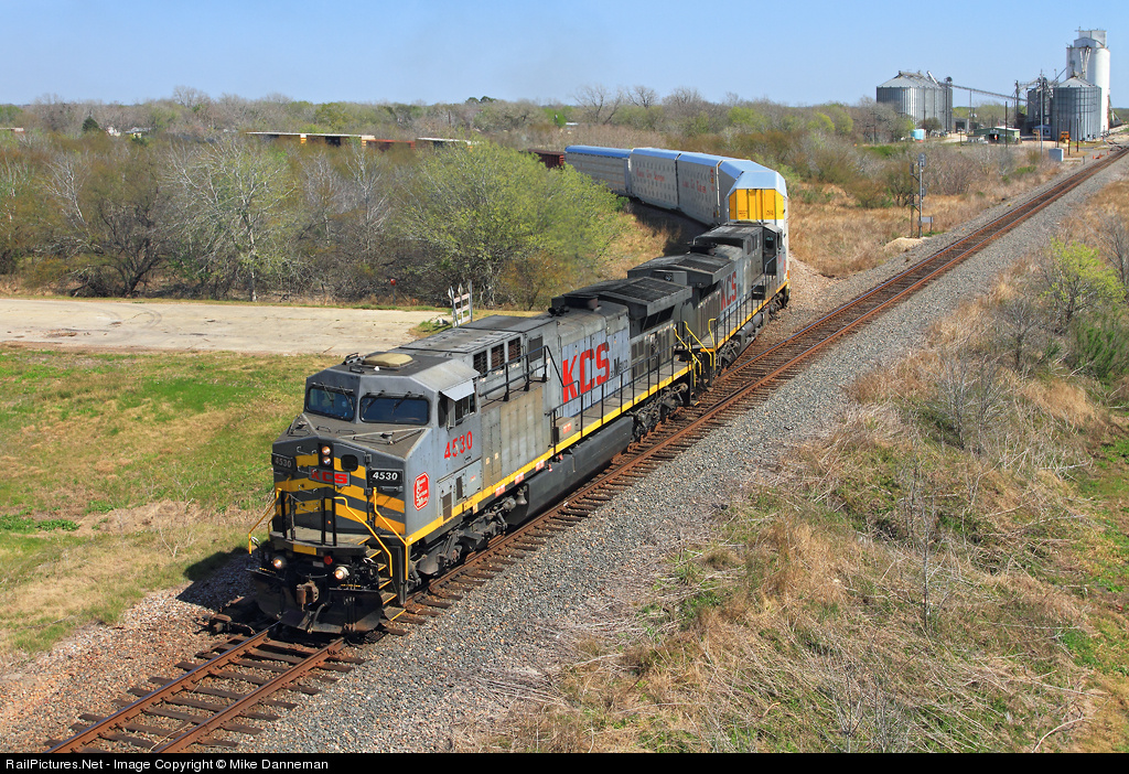 Curving through Placedo Kansas City Southern de Mexico AC4400CW Nos. 4530 and 4540 curve south through Placedo, Texas, on March 13, 2013. The train is leaving Union Pacific’s Cuero Subdivision for the Angleton Subdivision to Bloomington. KCS’s route to Mexico involves some trackage rights on UP, such as on this former Missouri Pacific route, to reach home territory on Tex-Mex track from Robstown to Laredo.