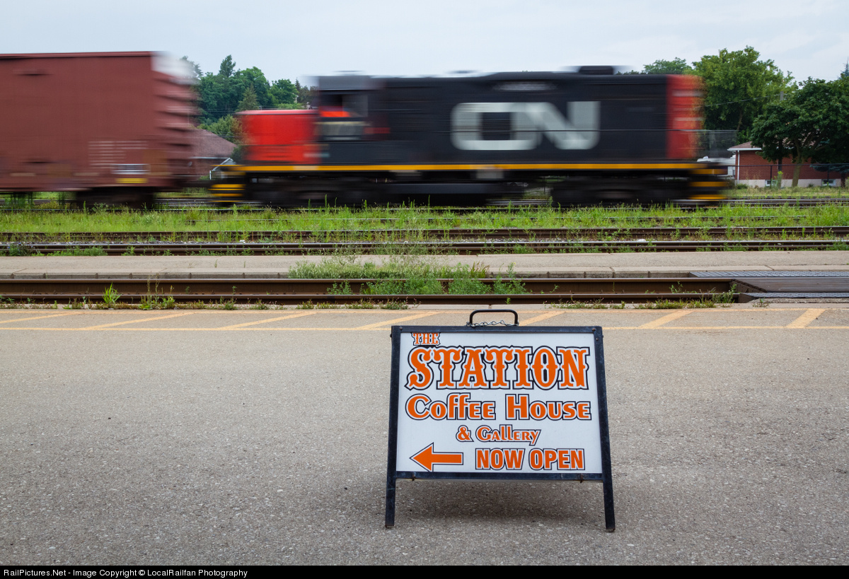 It is a cloudy and muggy afternoon in Brantford as CN 580's sole EMD GP9 blurs through the yard, enroute to serve some industries further east on the Dundas Sub. Later in the day 580 would head down the rickety Burford Spur to service Ingenia, the last customer on the line. The sign, of course points to the Station Coffee house, a place where many passengers and railfans alike can enjoy a nice cup of java trackside.