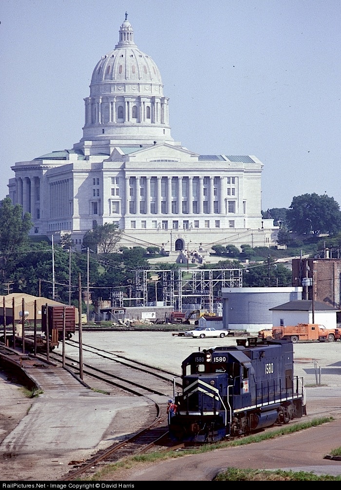 The imposing Missouri state capitol looming in the distance provides an interesting backdrop for just another day of switching in MP's (actually UP's by this date) small yard.