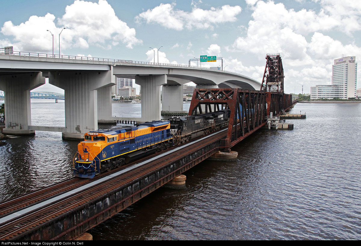 | For the third time a NS heritage unit has made it's way south to Jacksonville, and the first Norfolk Southern EMD heritage engine. Here, the Central RR of NJ Heritage unit makes it's way back to Simpson Yard over the FEC drawbridge in Downtown Jacksonville. |
