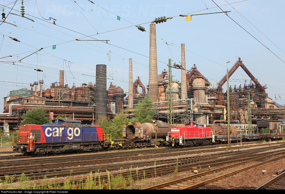 Moving liquid iron.... In front of the Unesco World Heritage "Ironworks Völklingen" SBB Cargo 203 652-3 and DB 294 954-3 are shunting different freight cars around the former steel mill. The SBB Cargo locomotive has some so called Torpedo cars attached. These heavy load freight cars are used to move liquid iron (temperature approx. 1400°C / 2550°F) from one factory to another. The DB locomotive meanwhile is moving end products.
