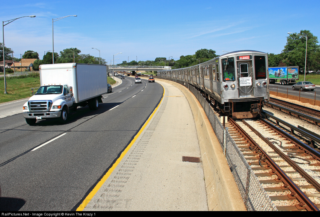An eight car train of 2200s races down the middle of the Kennedy Expressway on their was to Forest Park for the last time. Note the Congress / Milwaukee A train signs that were used for the final run.
