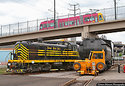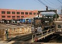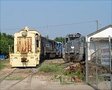 An interesting array of railroad equipment meet at the Oregon Rail Heritage Center in Portland Oregon: an Alco RSD-5, painted as the Nickel Plate Road 324, a Vanderbilt steam locomotive tender, a Trackmobile Railcar Mover, and a City of Portland Streetcar crossing the new SE Water Ave. bridge on the CL Line to the Oregon Rail Heritage Center and the Oregon Museum of Science and Industry (OMSI).