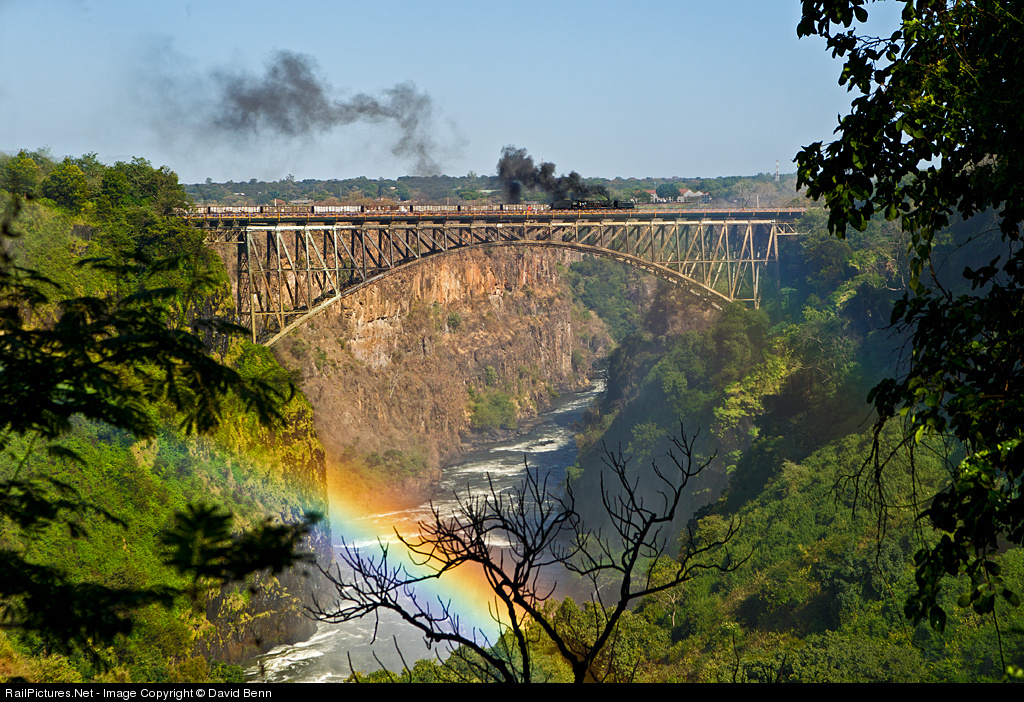 Geoffs Trains arranges photo runbys on what must be one of the most spectacular bridges in the world. The photograph was taken from the Zambian side of the border and the train was proceeding to the Zimbabwean side. The bridge was built by The Cleveland Bridge and Engineering Company from 1904 to 1905.