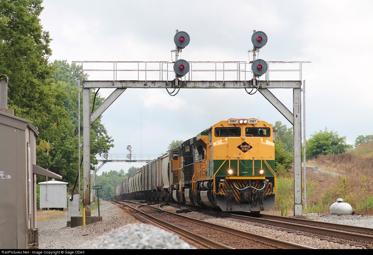 | After meeting NS 215, NS 55A throttles up under the searchlights with Reading 1067 leading the way. With old Southern signals on the way out on the CNO&TP, these searchlights at Wilmore still stand without a trace of the new PTC signals. |