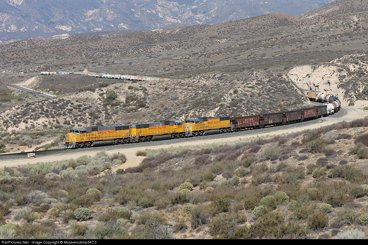 UP 2489 leads 2 other SD60's on a fairly long Mojave Flyer as it travels Northbound on the Palmdale Cutoff at Silverwood.