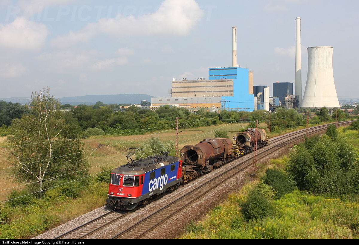 Moving liquid iron.... SBB Cargo Re 421 395-5 is moving in front of the power plant Ensdorf (Saar) two loaded so called torpedo cars from the smelter plant in Dillingen to the mill in Völklingen. The 16-axle special freight cars are used to move liquid iron (temperature approx. 1400°C / 2550°F) from one factory to another.
