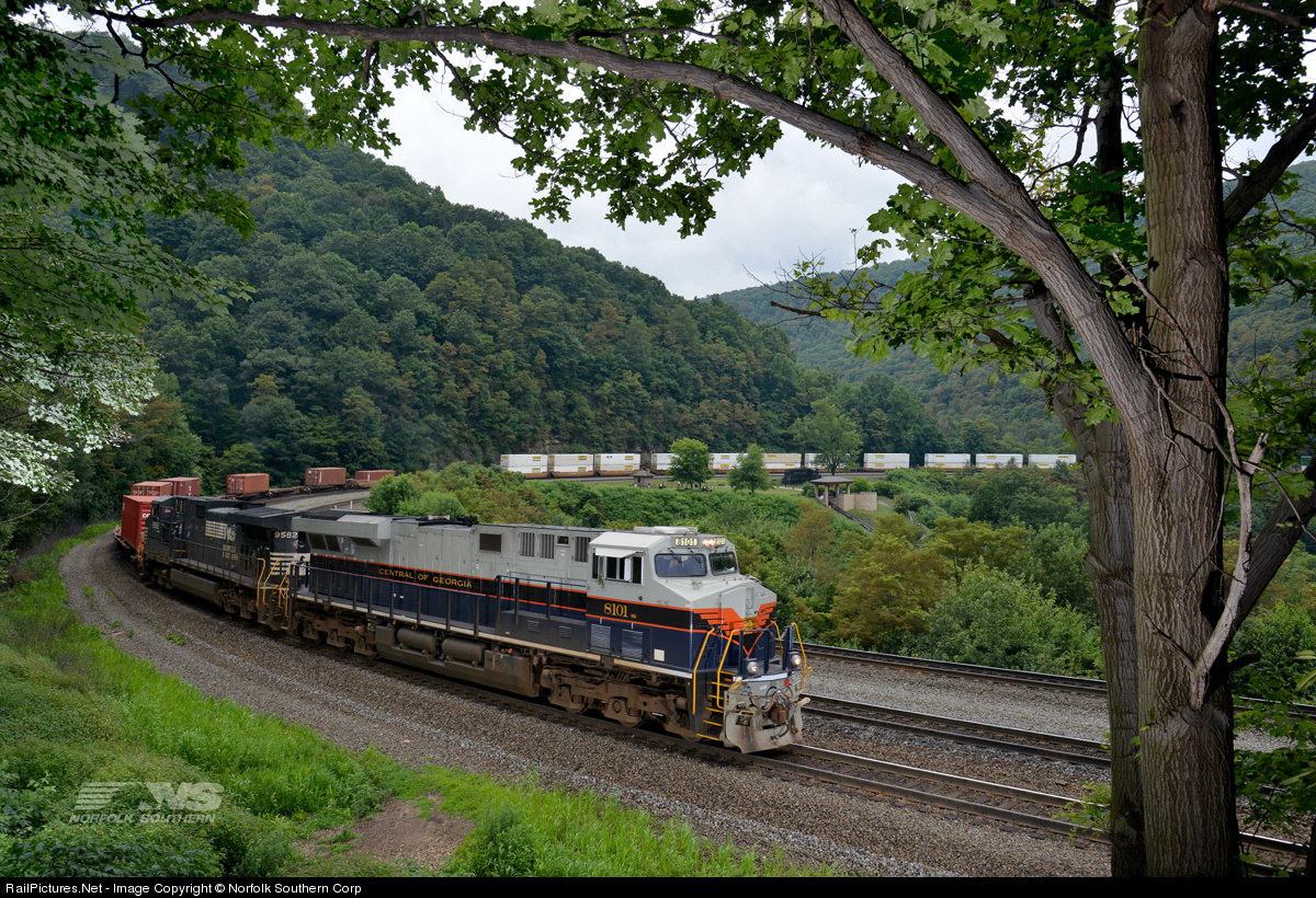 A long way from "home", the Central of Georgia heritage unit leads train 23Z up track three and around Horseshoe Curve, on its way from Harrisburg, PA, to Chicago. Photo by Casey Thomason. For more information about Norfolk Southern, visit www.nscorp.com