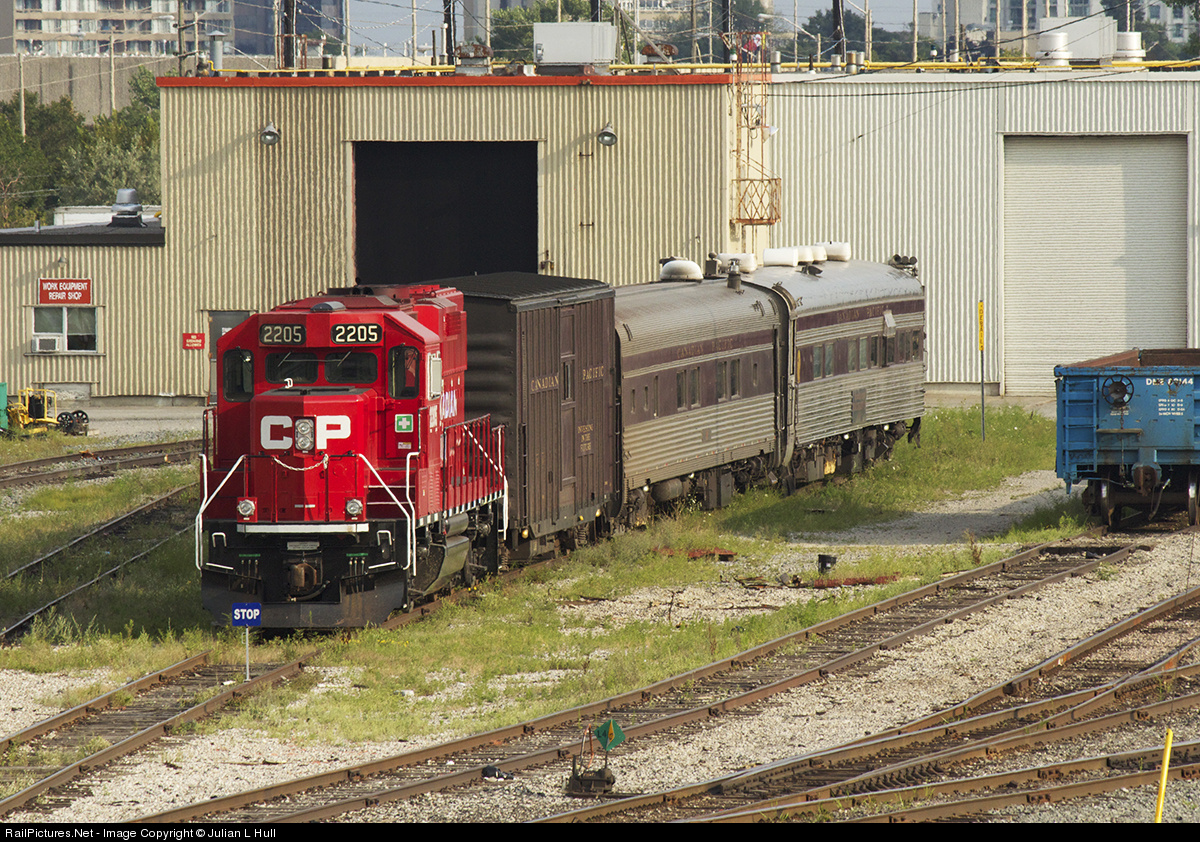 | 2205, one of CP's newest horses, idles on the old caboose track in Agincourt Yard with a TEC consist in tow. |